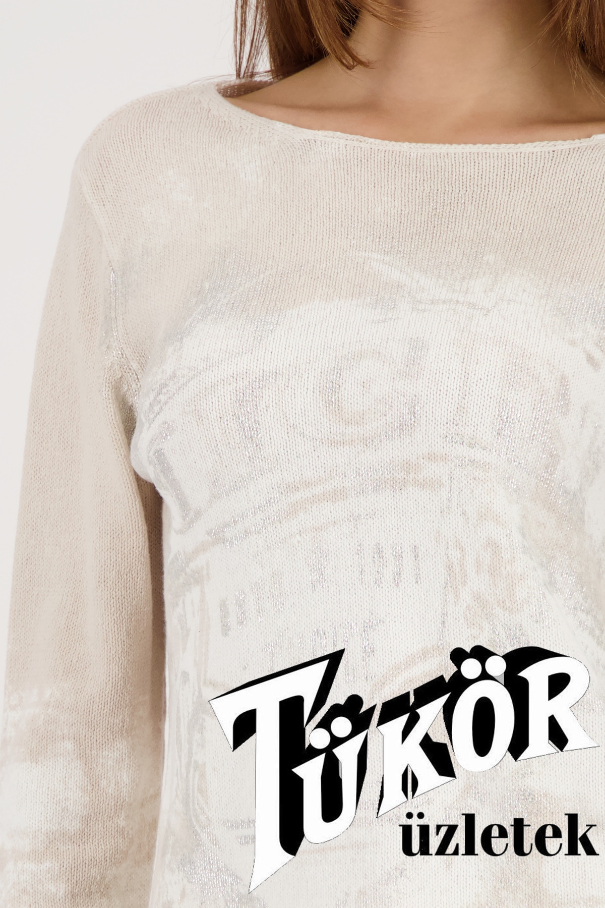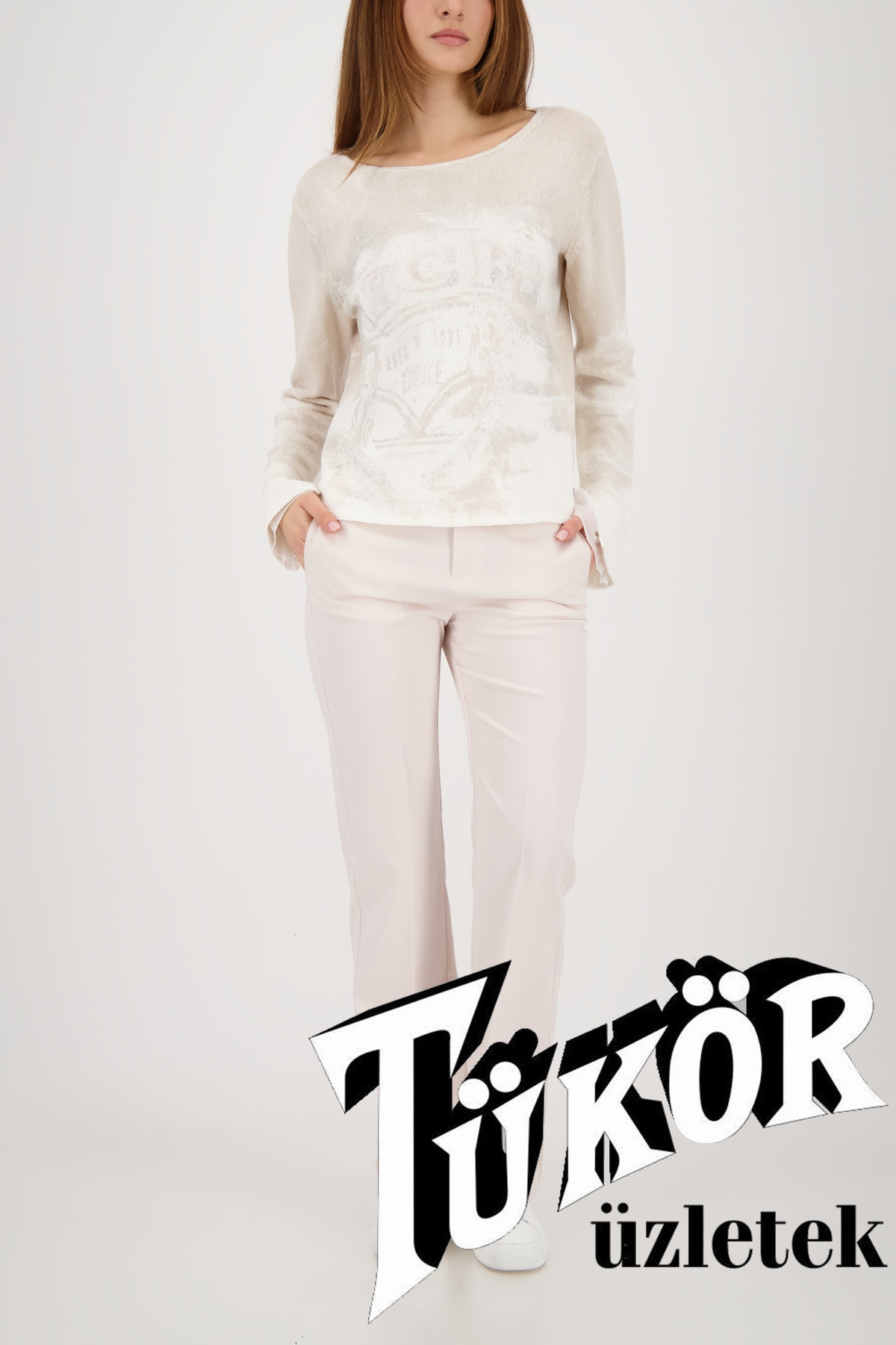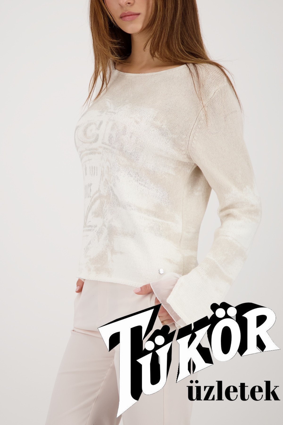 Monari női pulóver, lurex, kereknyakú, tölcsérujjú muszlinbetéttel