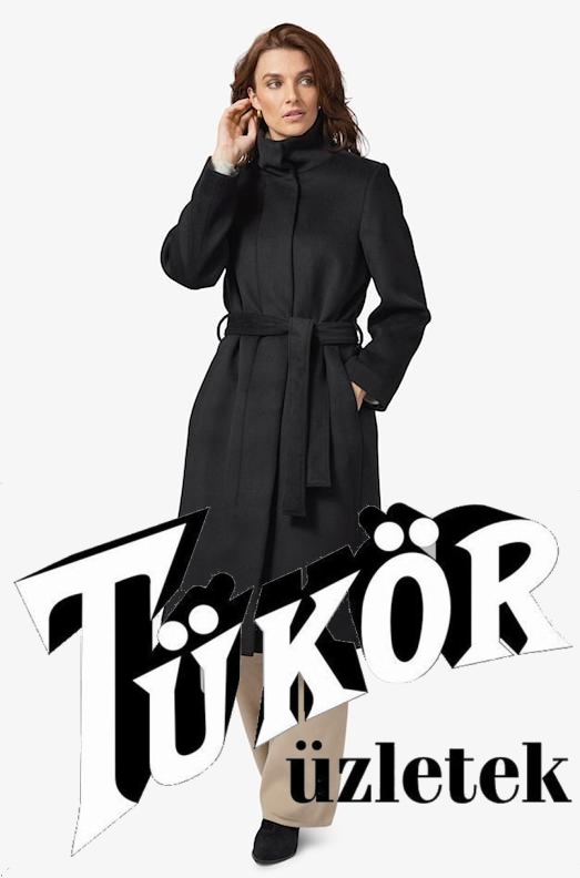 Frandsen női kabát, szövet, hosszú, öves, állógalléros