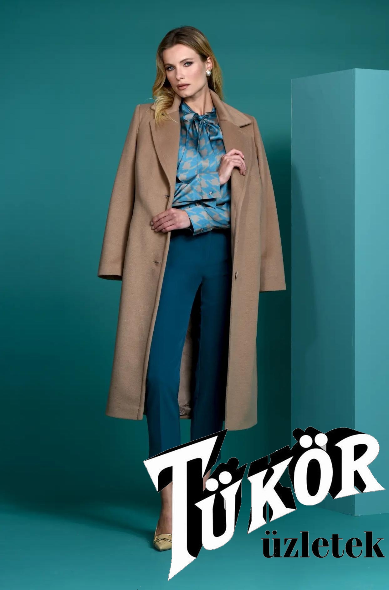 Estel női kabát, hosszú, szövet, öves